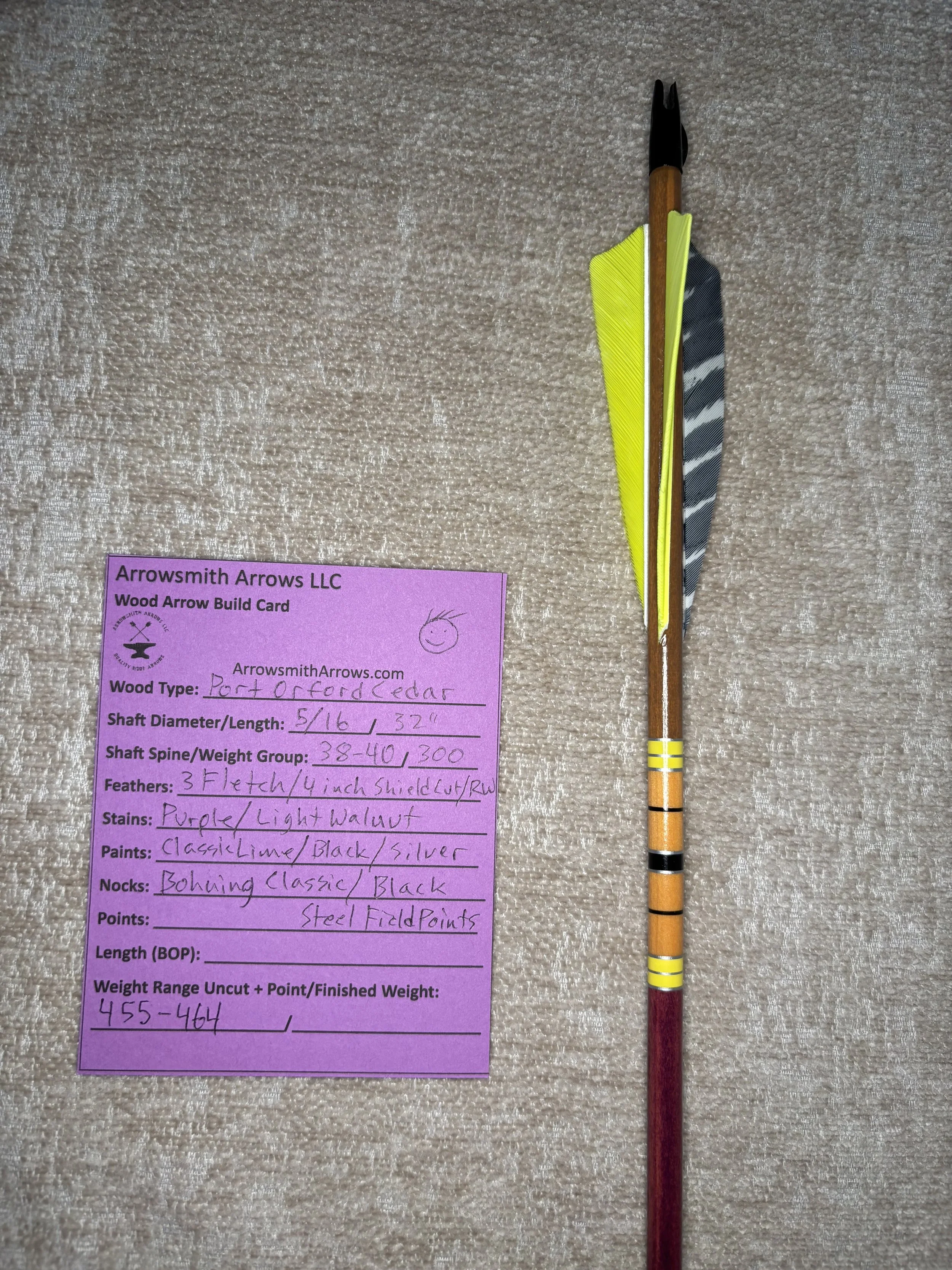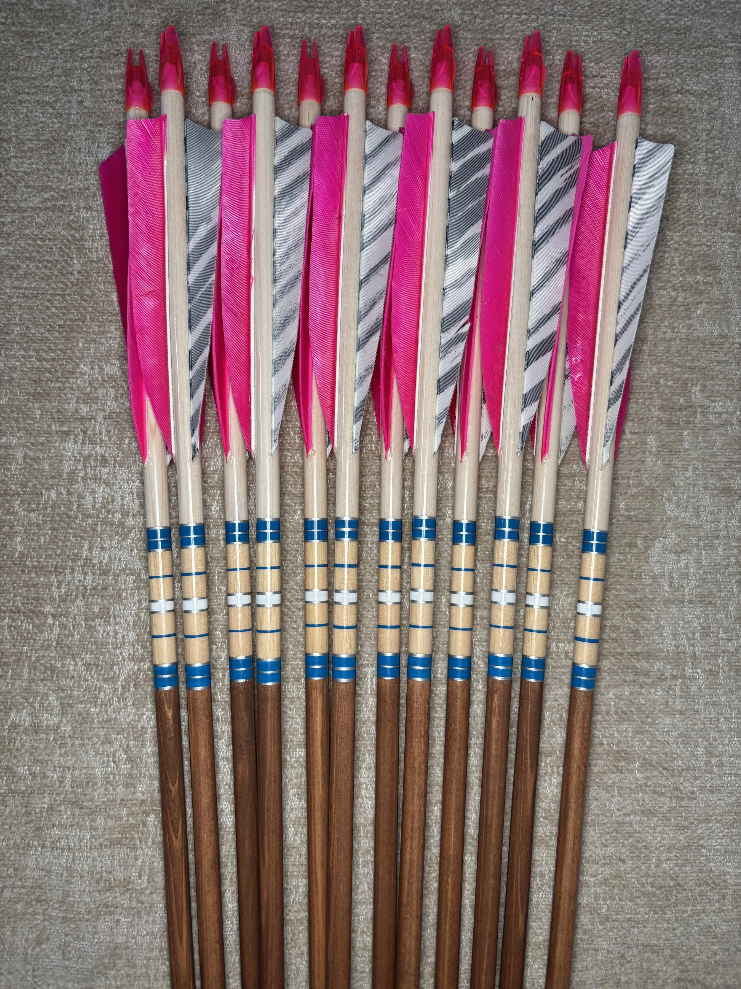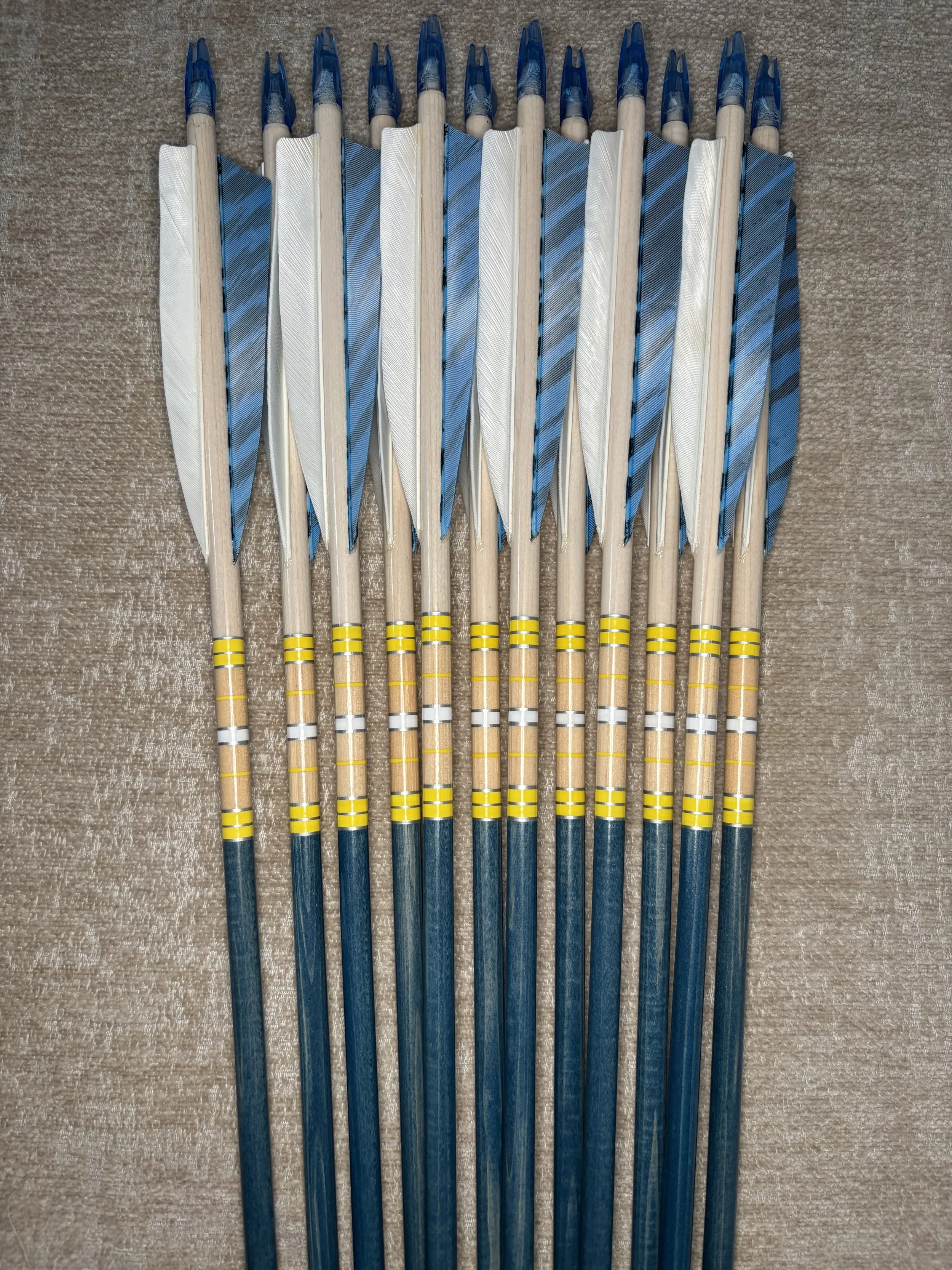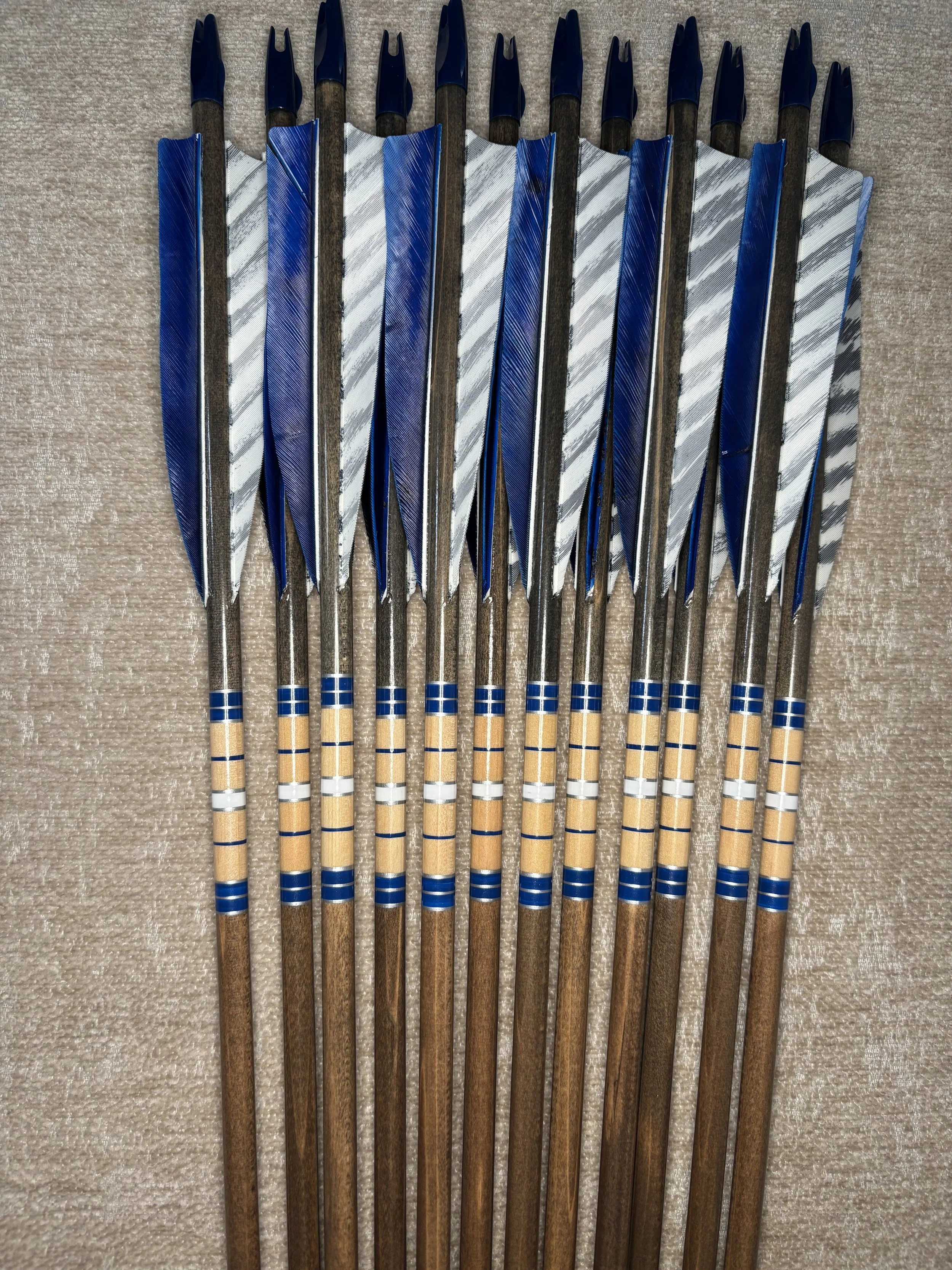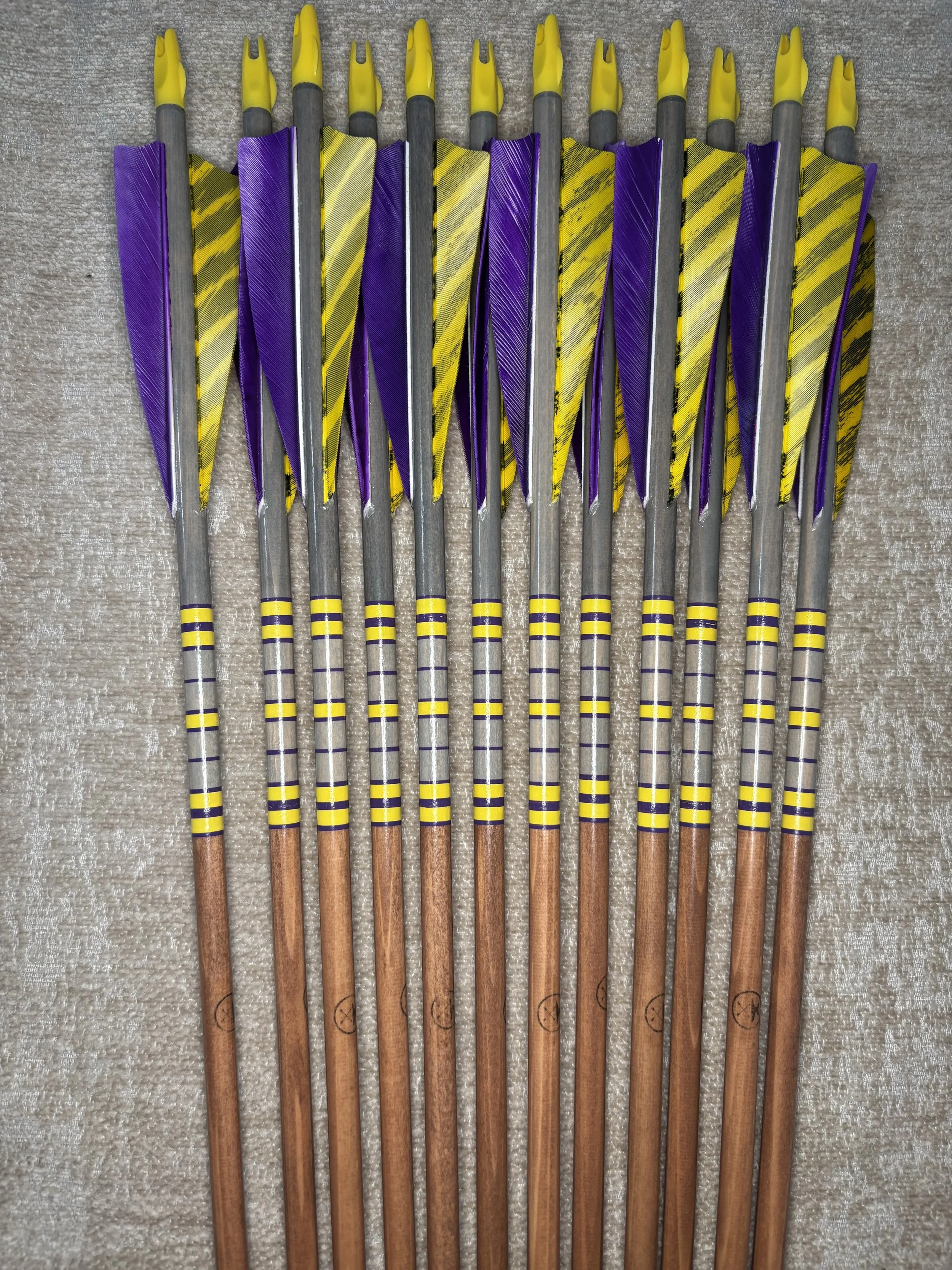 My build process includes hand straightening each shaft before and during the painting process, matching components by weight and aligning nocks with the wood grain in order to maximize consistency. Each arrow shaft is hand spine checked to verify spine prior to use. I use two tones of wood stain instead of crown dip, allowing the natural wood grain to show through. Multiple coats of clear gloss finish makes each color pop.