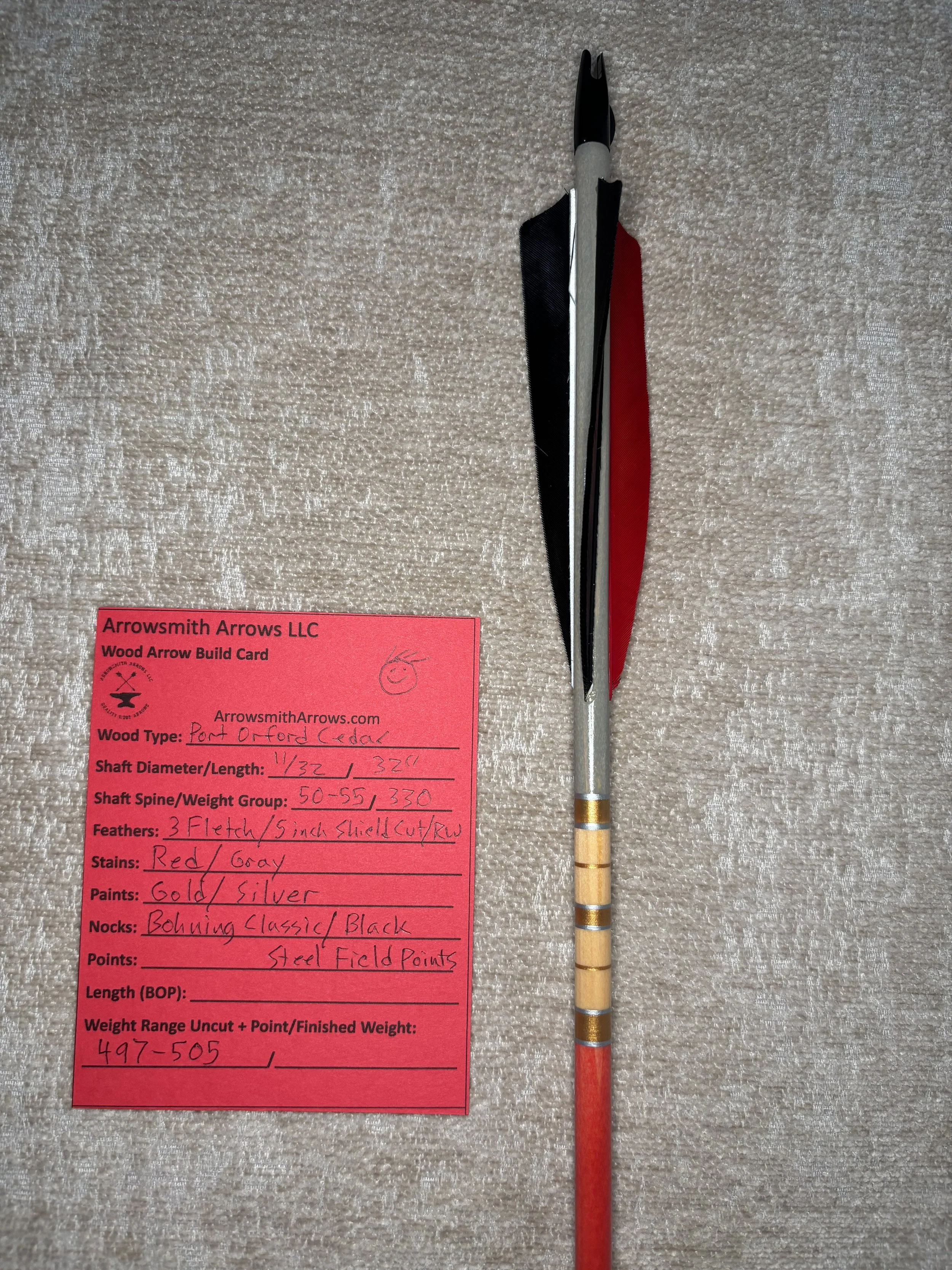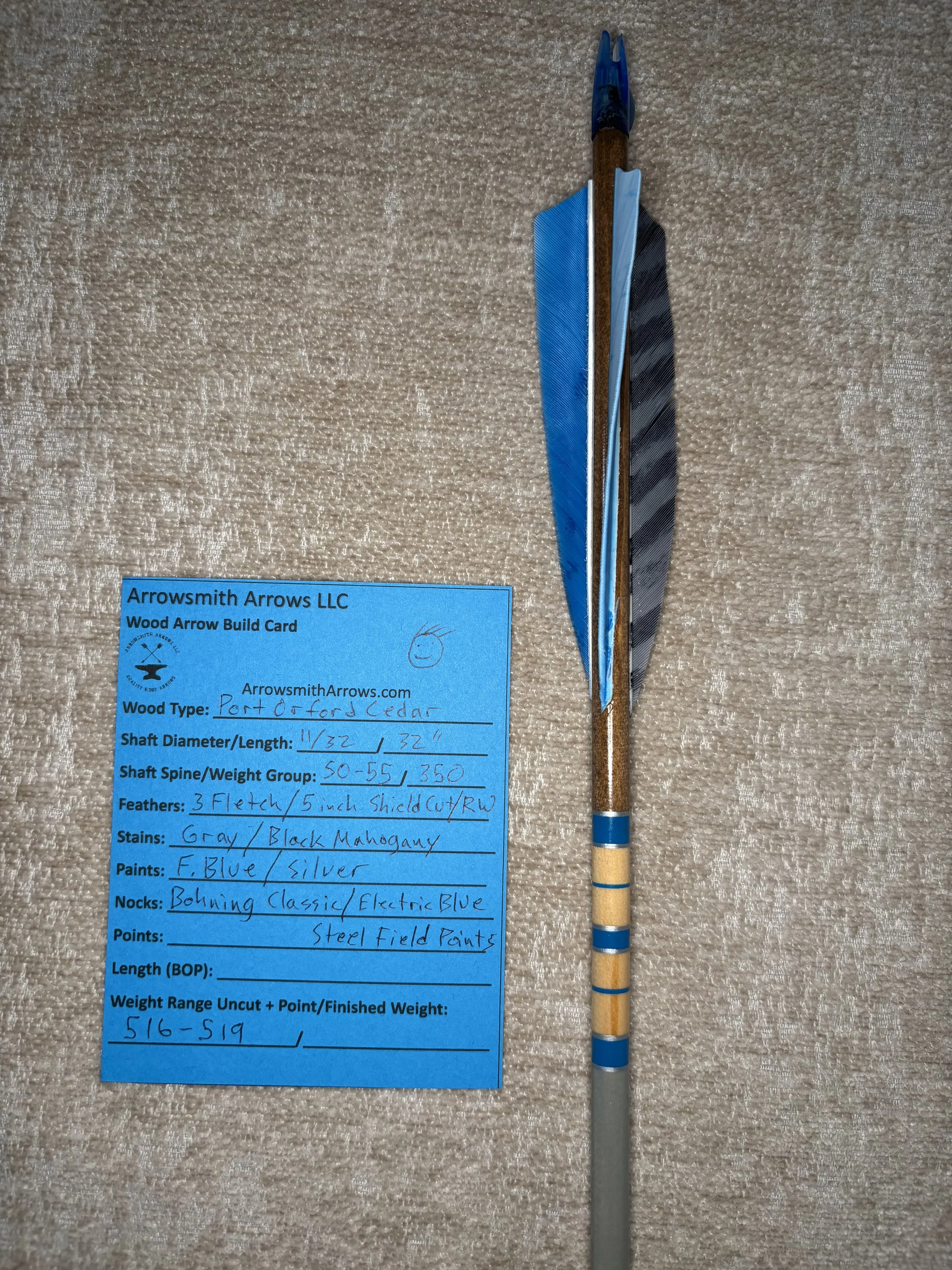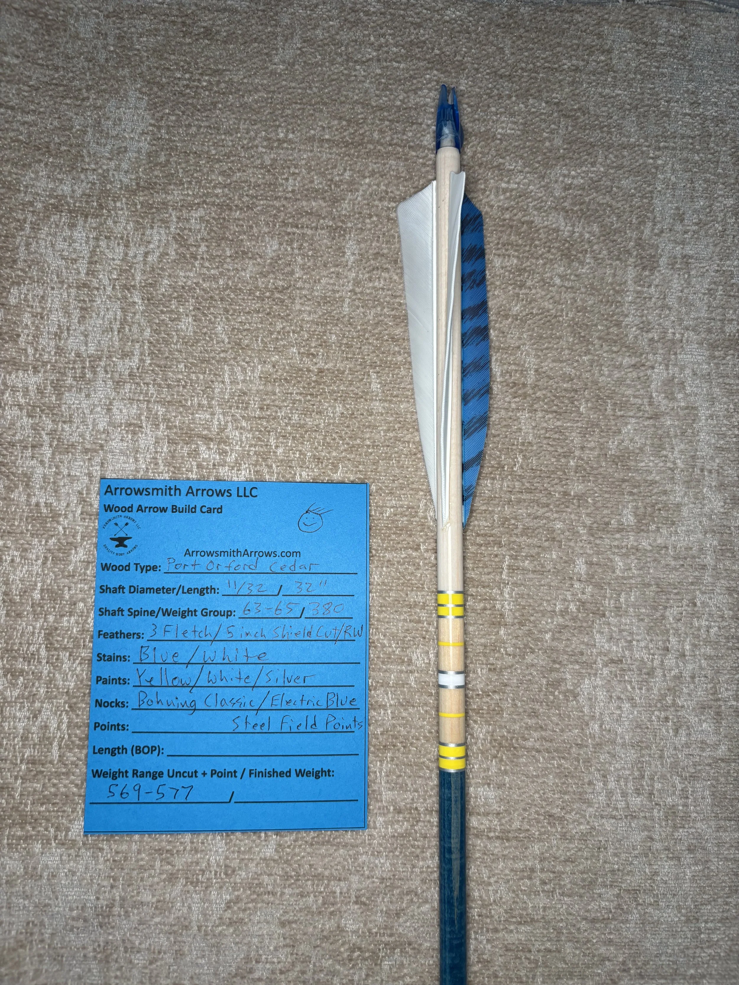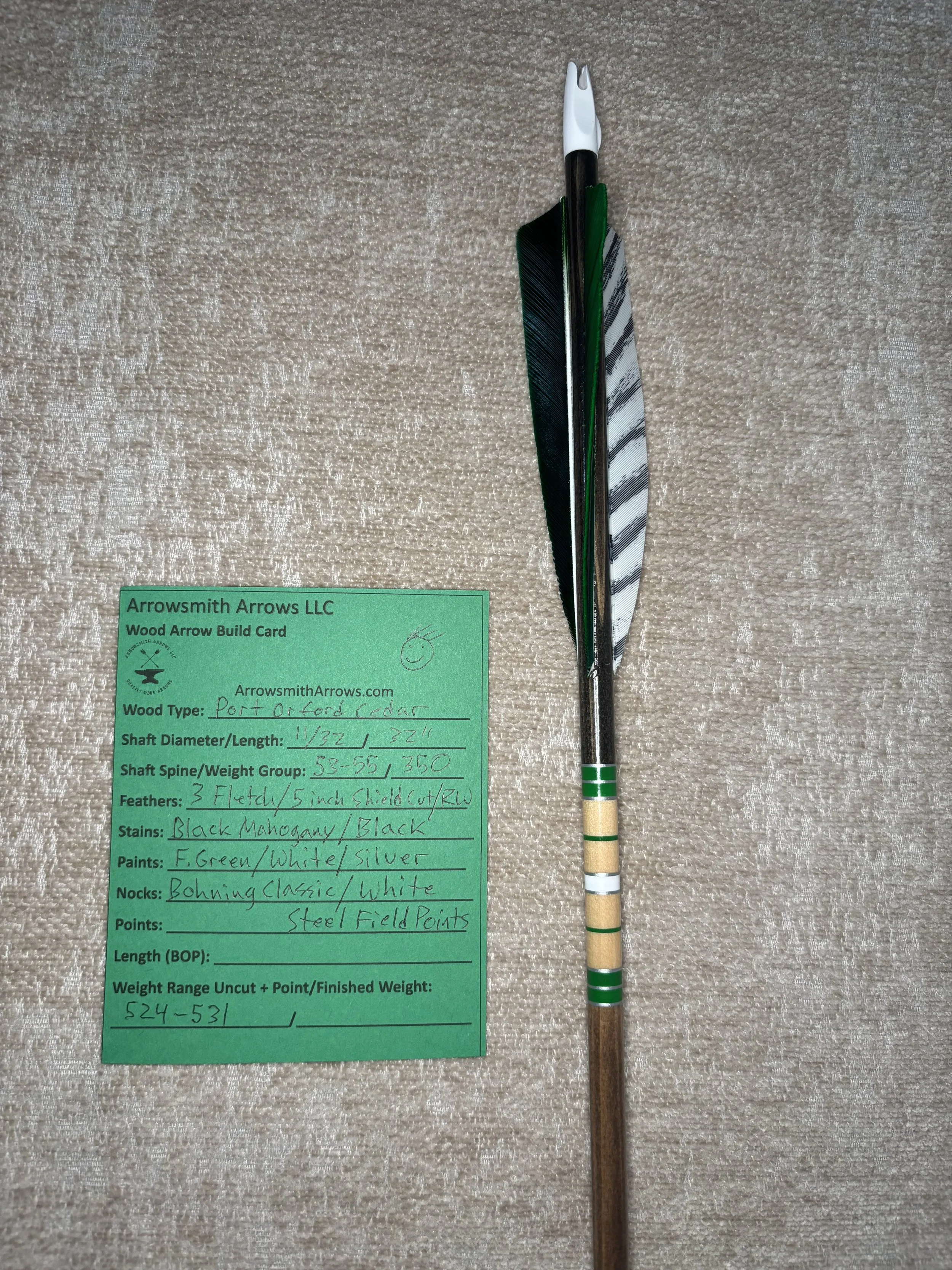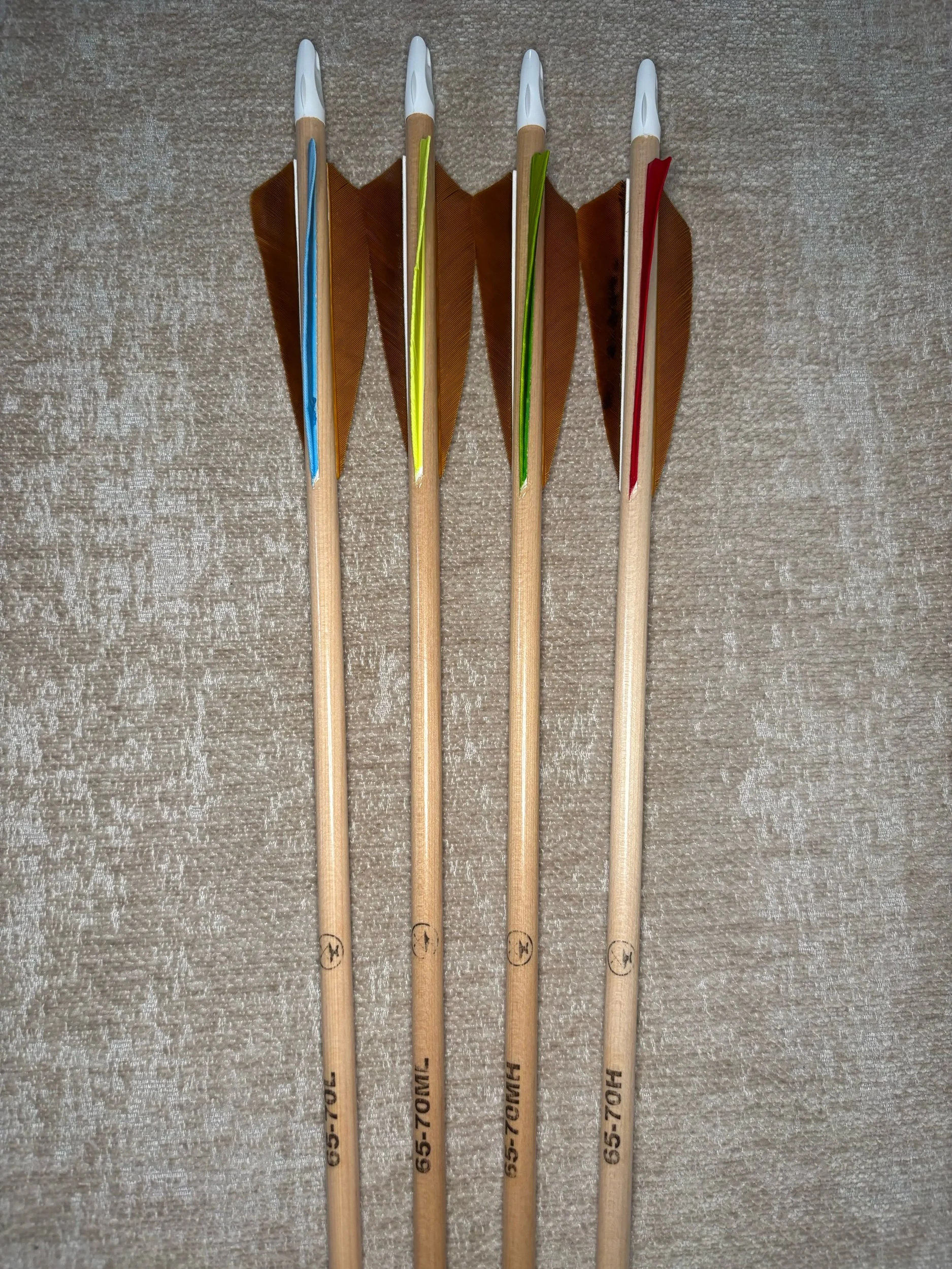 My build process includes hand straightening each shaft before and during the painting process, matching components by weight and aligning nocks with the wood grain in order to maximize consistency. Each arrow shaft is hand spine checked to verify spine prior to use. I use two tones of wood stain instead of crown dip, allowing the natural wood grain to show through. Multiple coats of clear gloss finish makes each color pop.