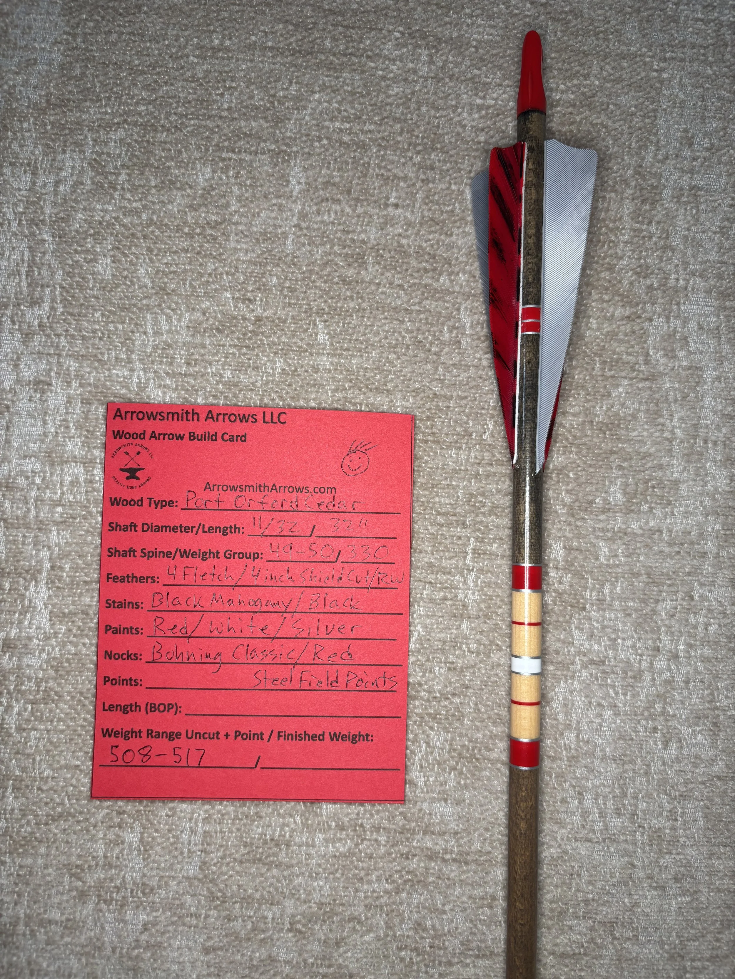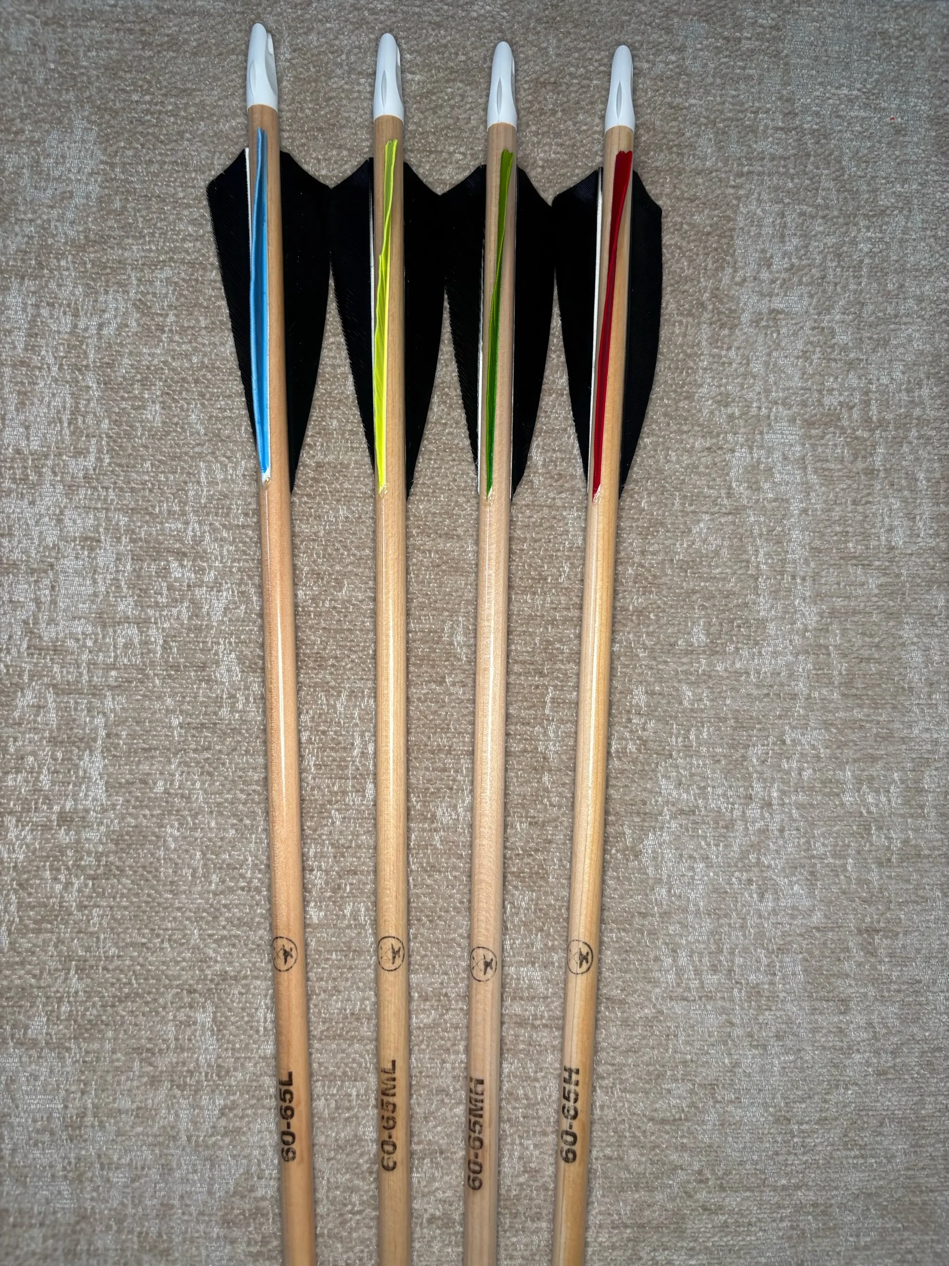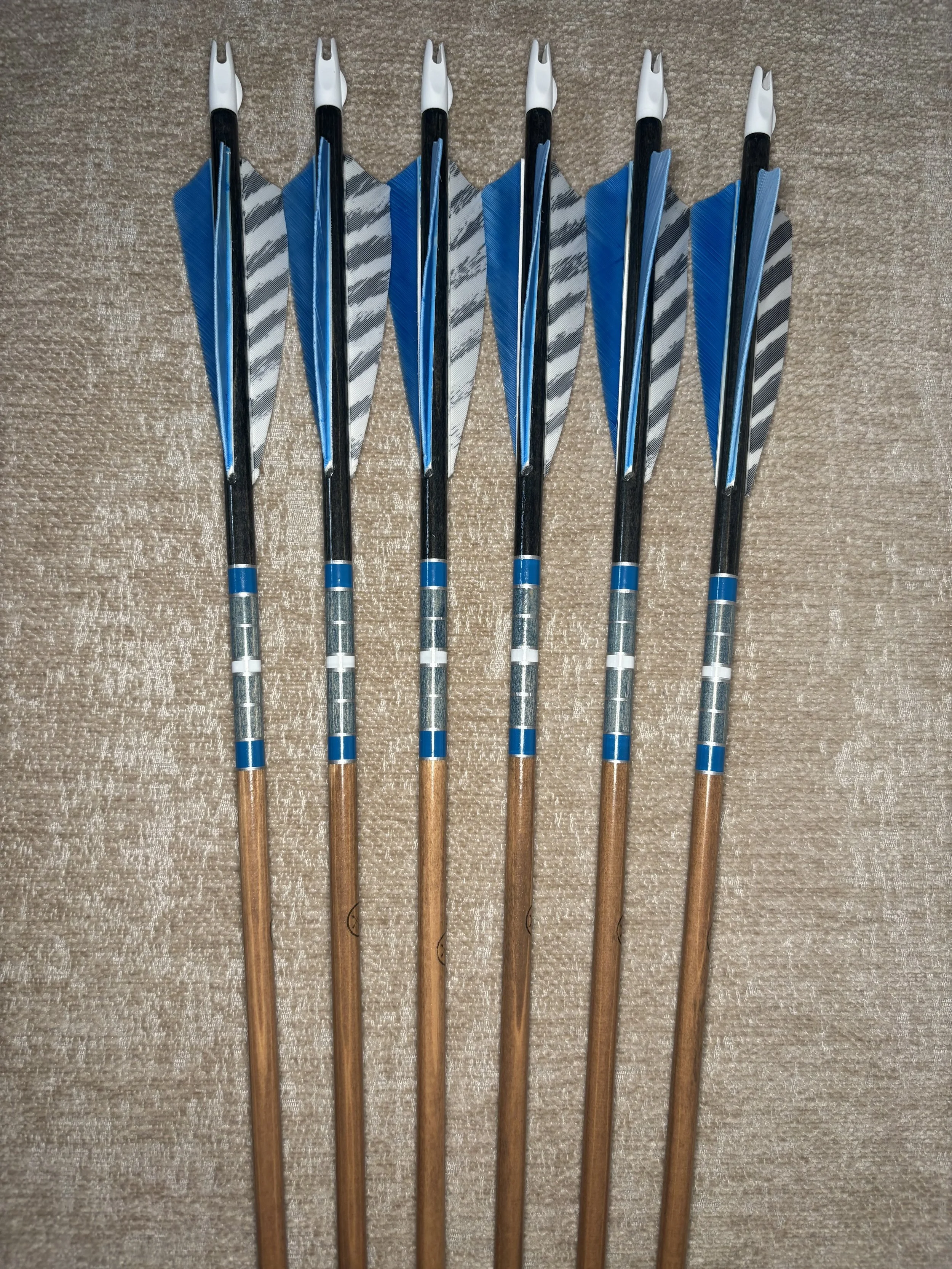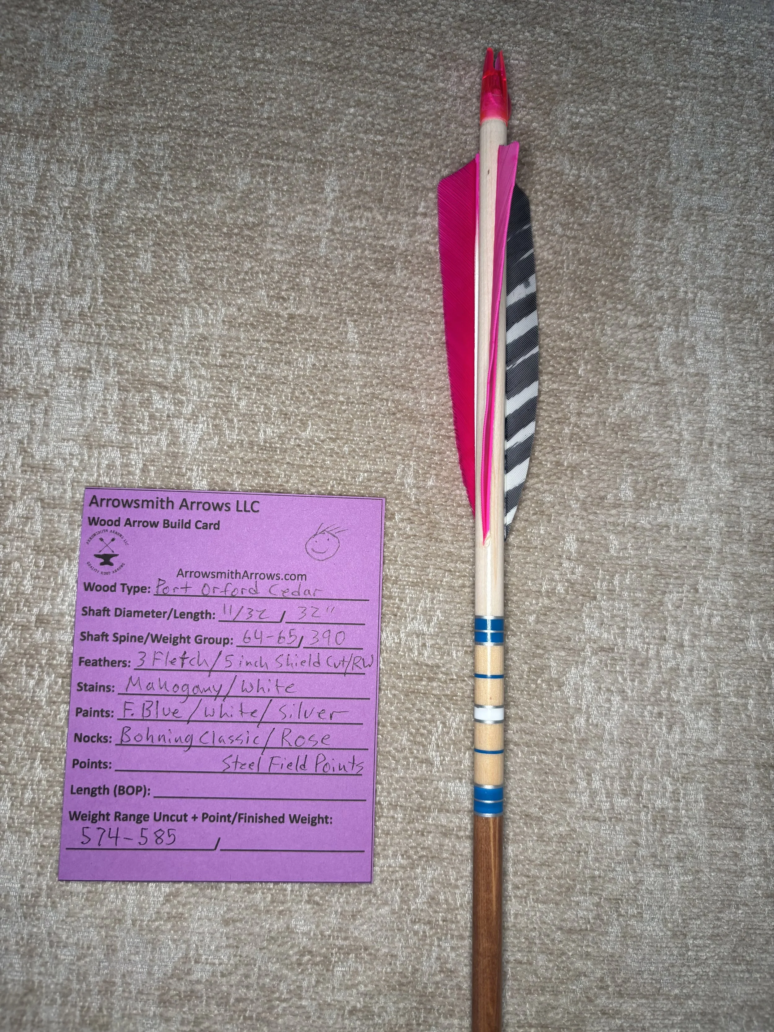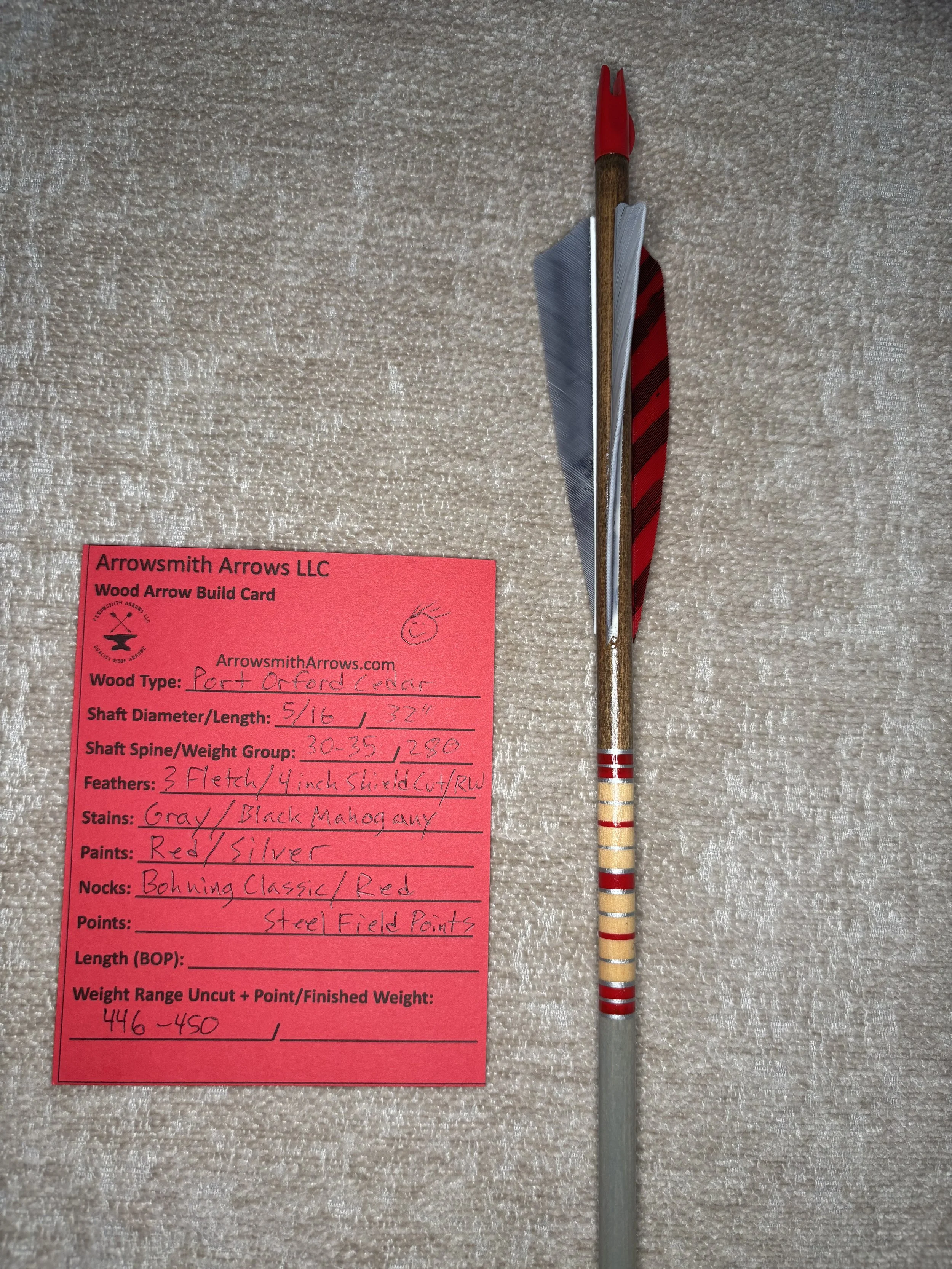 My build process includes hand straightening each shaft before and during the painting process, matching components by weight and aligning nocks with the wood grain in order to maximize consistency. Each arrow shaft is hand spine checked to verify spine prior to use. I use two tones of wood stain instead of crown dip, allowing the natural wood grain to show through. Multiple coats of clear gloss finish makes each color pop.