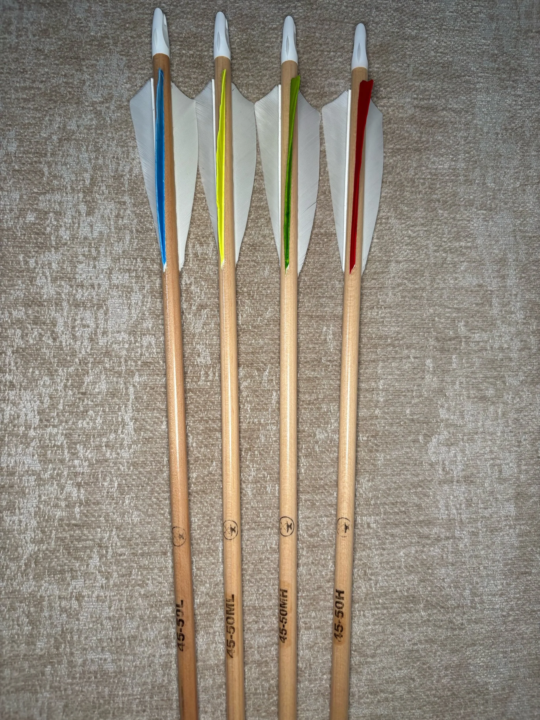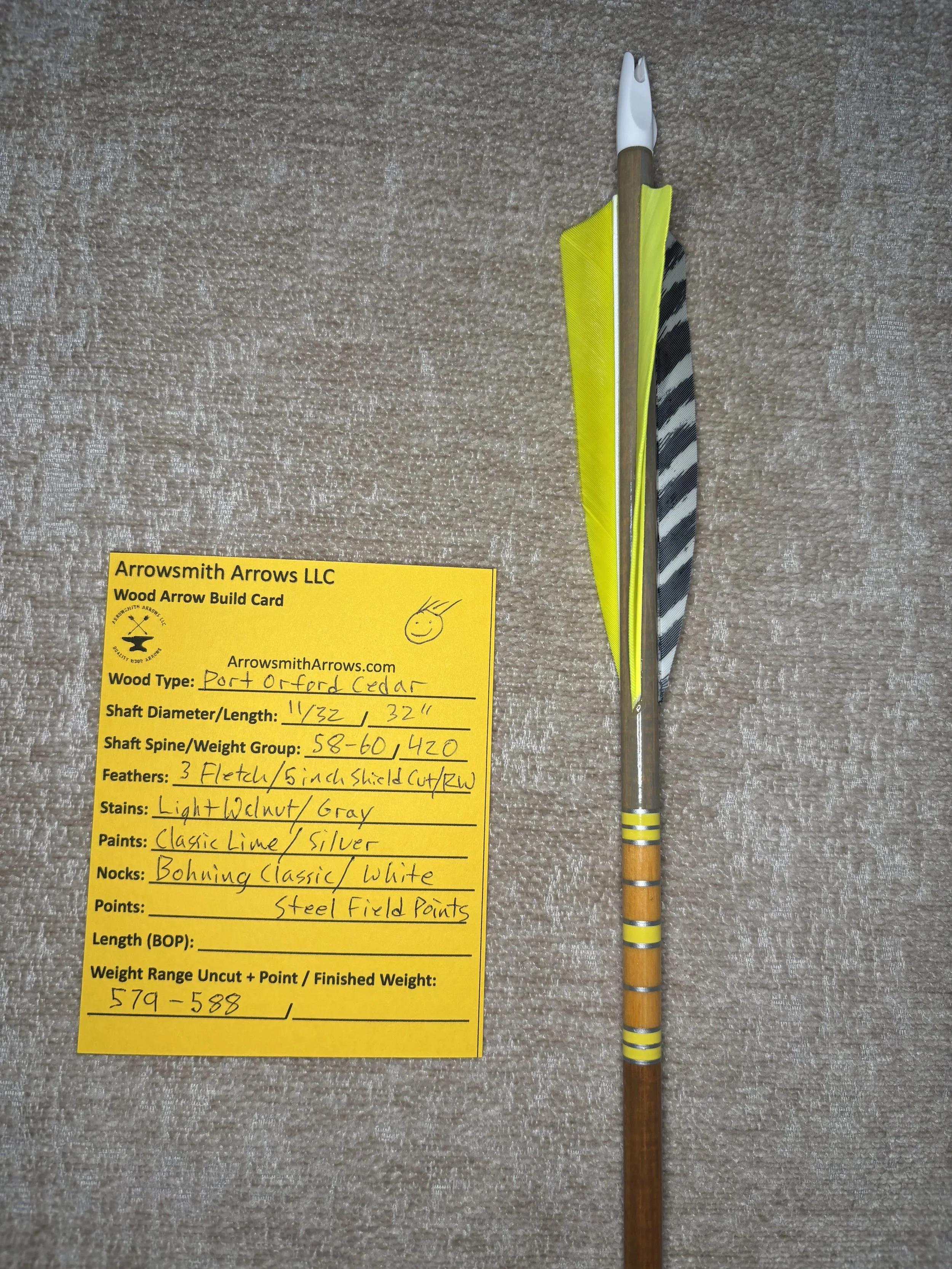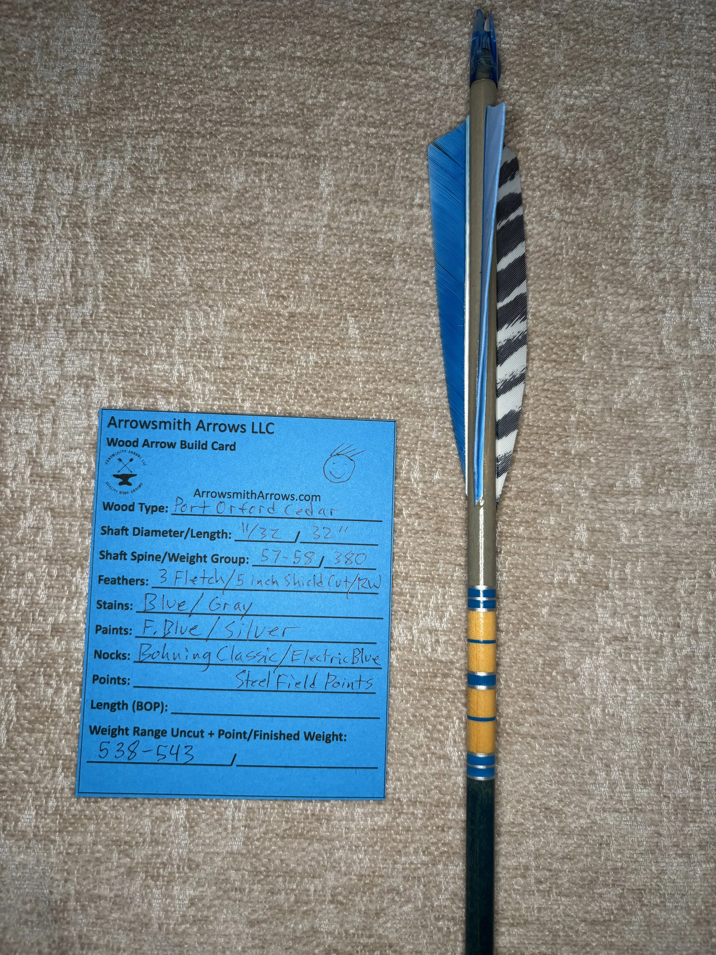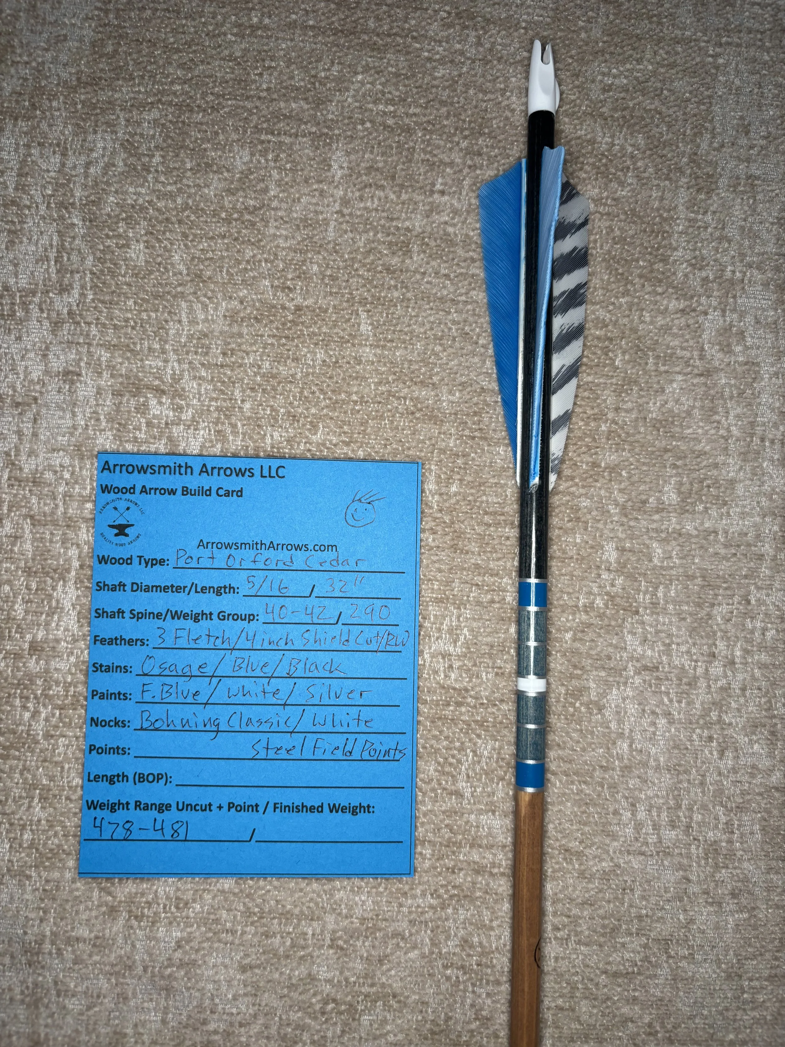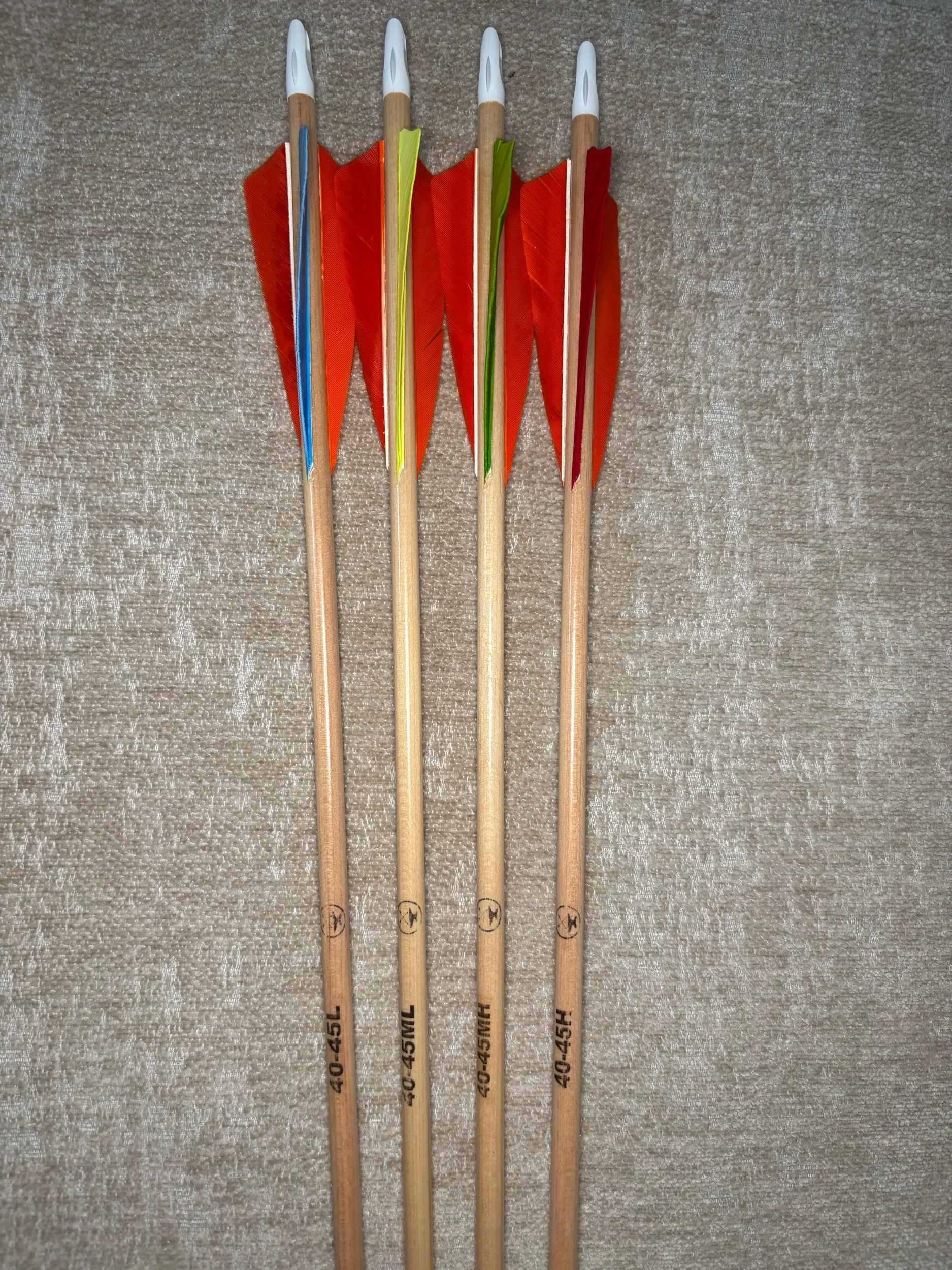 My build process includes hand straightening each shaft before and during the painting process, matching components by weight and aligning nocks with the wood grain in order to maximize consistency. Each arrow shaft is hand spine checked to verify spine prior to use. I use two tones of wood stain instead of crown dip, allowing the natural wood grain to show through. Multiple coats of clear gloss finish makes each color pop.